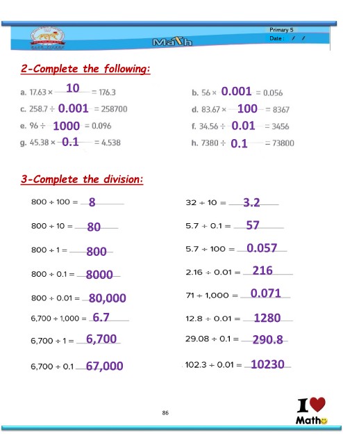 2-Complete the following: Primary 5 Date : 10 0.001 0.001 1000 100 0.1 0.01 0.1 3-Complete the division: 3.2 8 57 80 0.057 800 216 8000 0.071 80,000 6.7 1280 6,700 290.8 67,000 10230 86