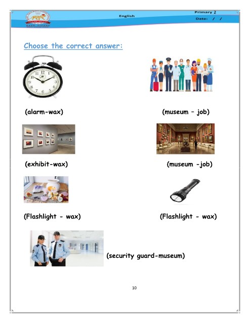 Choose the correct answer: (alarm-wax) (museum – job) (exhibit-wax) (museum -job) (Flashlight - wax) (Flashlight - wax) (security guard-museum) 10