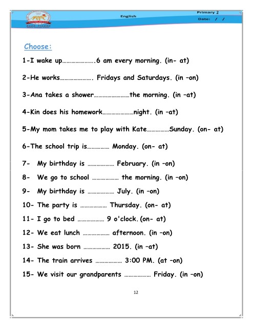 2-He works…………………. Fridays and Saturdays. (in –on)