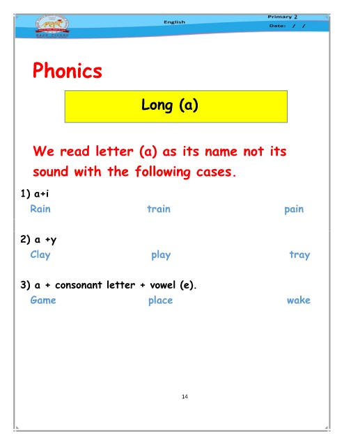 Phonics Long (a) We read letter (a) as its name not its sound with the following cases. 1) a+i train pain Rain 2) a +y play tray Clay 3) a + consonant letter + vowel (e). Game place wake 14