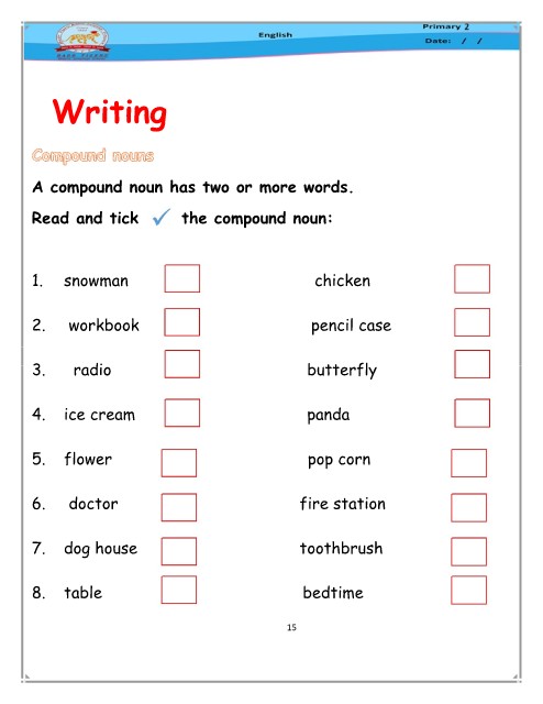 Writing A compound noun has two or more words. Read and tick the compound noun: 1. snowman chicken 2. workbook pencil case 3. radio butterfly 4. ice cream panda 5. flower pop corn 6. doctor fire station 7. dog house toothbrush 8. table bedtime 15