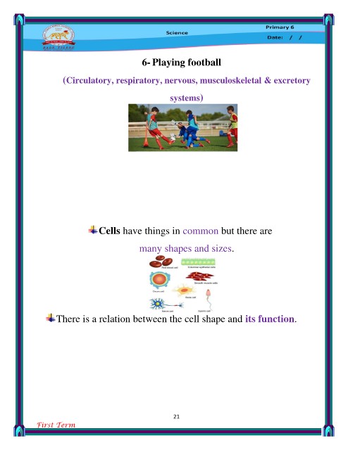6- Playing football (Circulatory, respiratory, nervous, musculoskeletal & excretory systems) Cells have things in common but there are many shapes and sizes. There is a relation between the cell shape and its function. 21 First Term