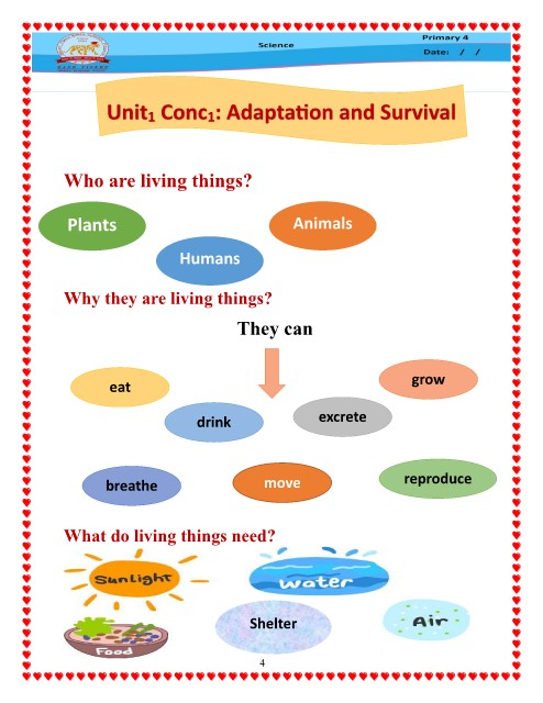 Unit1 Conc1: Adaptation and Survival Who are living things? Plants Animals Humans Why they are living things? They can eat grow drink excrete breathe move reproduce What do living things need? First Term Shelter 4 4