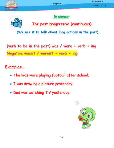 Grammar The past progressive (continuous) (We use it to talk about long actions in the past). Examples:- The kids were playing football after school. I was drawing a picture yesterday. Dad was watching T.V yesterday. 10