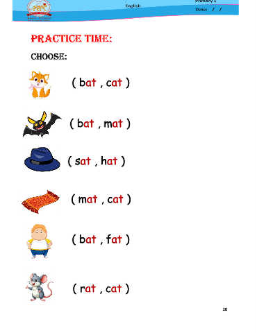 Practice time: Choose: ( bat , cat ) ( bat , mat ) ( sat , hat ) ( mat , cat ) ( bat , fat ) ( rat , cat ) 20