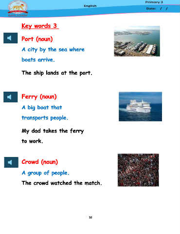 Key words 3 Port (noun) A city by the sea where boats arrive. The ship lands at the port. Ferry (noun) A big boat that transports people. My dad takes the ferry to work. Crowd (noun) A group of people. The crowd watched the match. 10