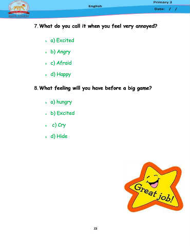7. What do you call it when you feel very annoyed? o a) Excited o b) Angry o c) Afraid o d) Happy 8. What feeling will you have before a big game? o a) hungry o b) Excited o c) Cry o d) Hide 23