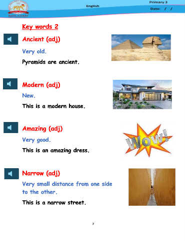 Key words 2 Ancient (adj) Very old. Pyramids are ancient. Modern (adj) New. This is a modern house. Amazing (adj) Very good. This is an amazing dress. Narrow (adj) Very small distance from one side to the other. This is a narrow street. 7