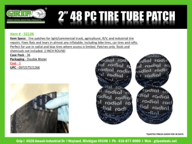 Item Specs - Tire patches for light/commercial truck, agricultural, R/V, and industrial tire