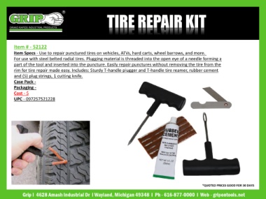 Item Specs - Use to repair punctured tires on vehicles, ATVs, hard carts, wheel barrows, and more.