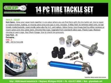 Item Specs - Keep your repair tools together in one place where you can find them with this tire tackle set. Use to repair