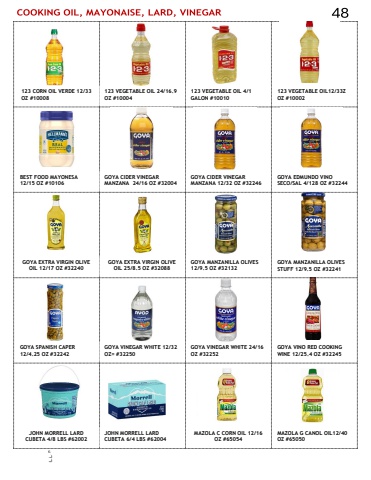 123 VEGETABLE OIL 24/16.9 OZ #10004123 VEGETABLE OIL 4/1 GALON #10010123 VEGETABLE OIL12/33Z OZ #10002123 CORN OIL VERDE 12/33 OZ #10008BEST FOOD MAYONESA 12/15 OZ #10106GOYA CIDER VINEGAR MANZANA 24/16 OZ #32004GOYA CIDER VINEGAR MANZANA 12/32 OZ #32246GOYA EDMUNDO VINO SECO/SAL 4/128 OZ #32244GOYA EXTRA VIRGIN OLIVE OIL 12/17 OZ #32240GOYA EXTRA VIRGIN OLIVE OIL 25/8.5 OZ #32088GOYA MANZANILLA OLIVES 12/9.5 OZ #32132GOYA MANZANILLA OLIVES STUFF 12/9.5 OZ #32241GOYA SPANISH CAPER 12/4.25 OZ #32242GOYA VINEGAR WHITE 12/32 OZ= #32250GOYA VINEGAR WHITE 24/16 OZ #32252GOYA VINO RED COOKING WINE 12/25.4 OZ #32245JOHN MORRELL LARD CUBETA 4/8 LBS #62002JOHN MORRELL LARD CUBETA 6/4 LBS #62004MAZOLA C CORN OIL 12/16 OZ #65054MAZOLA G CANOL OIL12/40 OZ #650503
