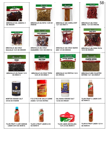 MIRAVALLE (G) SOYA 12/8 OZ #00840MIRAVALLE (M) CANELA ENT 12/1 OZ #00111MIRAVALLE (M) CHILE ARBOL 12/3 OZ #00306MIRAVALLE (G) JAMAICA 3 OZ #00309MIRAVALLE (M) CHILE GUAJILLO 12/3 OZ #00305MIRAVALLE (M) CHILE HABANERO 1/0.5 OZ #00116MIRAVALLE (M) CHILE NUEVO MEX 1/3 OZ #00304MIRAVALLE (M) CHILE PUYA 12/2 OZ #00203MIRAVALLE (O) PASAS 12/4 OZ #00413MIRAVALLE (X) CHILE TEPIN 12/0.25 OZ #00611MIRAVALLE (X) PEPITAS 12/4 OZ #99042MIRAVALLE MINI CILANTRO ENTERO 12/1 OZ #00537MORTON IODIZED SALT 24/26 OZ #36008P.D.G PICO DE GALLO CARNE ASADA 12/4 OZ #67002SAL BAHIA IODIZED SALT 12/26 OZ #00201TAJIN FRUIT C LIMON 24/5 OZ #69012TAJIN FRUIT C LOW SODIUM LIMON 24/5 OZ #69016TAJIN G FRUIT LIMON 6/32 OZ #69015TAJIN LIMON MICHELADA 12/4.23 OZ #69014TAJIN M FRUIT LIMON 12/14 OZ #69010