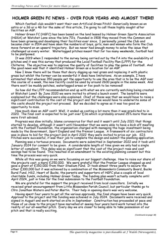 ProvidingNewsandViewsformorethan30yearsPage14ThequarterlymagazineispurchasableatJWalsh(Newsagents),HOLMERGREENFCNEWS-OVERFOURYEARSANDALMOSTTHERE!Whichfootballclubwouldn%u2019twanttheirownArtificialGrassPitch?Genericallyknownasan astro or a 3G or a 4G for the sake of this article, I%u2019m going to call these highly sought after facilities an AGP.Holmer GreenFC(HGFC) has beenbasedonthelandleasedby Holmer GreenSports Association (HGSA) at Watchet Lane since the late 70%u2019s.Founded in 1908 they moved from the Common and have been growing and developing their facilities ever since.I personally joined the Club and became chair in 2014 and have seen the numbers of boys, girls, men and women who form the Club move forward on an upward trajectory.But we never had enough money to solve the issue that challenged us every winter.Waterlogged pitchesmeant that for too many weekends, football had to be postponed.Itwas 2019 whenI responded to thesurvey being carried out by theFAintotheavailability of pitches and it was this survey that produced the Local Football Facility Plan (LFFP) for the Chilterns.Theobjectivewas to improve thequality of facilities to play thegameof football.And the good news was that it identified Holmer Green as a location for an AGP.Now I know there will be those that decry digging up real grass and replacing it with plastic grass but whilst the former can be wonderful it does have limitations.As an example, I have estimatedthatwhereas350people gettheopportunitytousetheareathatistobe theAGP over thecourseof aweek,thenewfacilitycouldbeusedbyaround2600peopleinthesameweek.And there won%u2019t be muddy patches, waterlogged areas or fox pooh to be removed!SohowdidtheLFFP recommendationend upwithwhatwearecurrently watching beingcreated at Watchet Lane?By June 2020 we were invited to attend a launch event.The benefits were explainedbutthechallengeswerealsoexplained.Chief of these wasthatwewouldhaveto raisea significant contribution to the cost of the project and that we would have to underwrite some of the costs should the project not proceed.But we decided to agree as it was too good an opportunity to miss.How much does an AGP cost?Well, it ended up costing a lot more than it was predicted to in 2020.Thefinalcostisexpected tobejustover%u00a31mwhichisprobablyaround25%morethanwe were first advised.Progress was slow initially, blame coronavirus for that and it wasn%u2019t until July 2021 that things started to develop, although it wasn%u2019t until November that we were able to have a kick off meeting with the Football Foundation, the organisation charged with managing the hugeinvestment being made by the Government, Sport England and the Premier League.A framework of six contractors was in place to bid for the project and in April 2022 they were invited to price our job.SIS Pitchesweresuccessful,itwastheirjobtocompletethedesignandsubmittheplanningapplication.Planning was a tortuous process.Documents weresubmittedin September 2022 and it took until January 2024 for consent to be given.A considerable length of time given we only had a single letter of complaint.This delay was so significant that the cost of the project rose and costsavingshadtobefound.Thisresultedinanamendmenttotheexistingplanningconsentbutthis time the process was very quick.Whileallthis was goingon wewerefocussing onour biggestchallenge.How toraiseour shareof the projects cost, a mere %u00a3250,000.We were grateful that the Premier League stepped up and gave a grant of %u00a3150,000 from their Stadium Fund.It took almost three years to secure theother%u00a3100,000butitwasachievedbyacombinationoftheMissenden%u2019sCommunityBoard,Bucks Rural Fund, HS2, Heart of Bucks, the parents and supporters of HGFC plus a couple of local charitable funds, including Holmer Green Today.The funding plan wasn%u2019t actually complete until April 2024, just in time for the final submission to the Football Foundation.We are grateful for the support the project received from local councillors.Initially we receivedgreatencouragementfromLittleMissendenParishCouncil,butparticularthanksgoto Cllrs Jonathan Waters and Peter Martin.Their help in opening doors was very welcome.Having spent four years to get all the various approvals, the final stages have been very quick. ApprovaltotheprojectandthefundingwasachievedinJuly2024.Documentswerereceivedand signed in August and work started on site in September.Construction has proceeded at pace and those of us close to the project have marvelled at seeing four years hard work turned into the reality of our all-weather pitch.Every day we are closer to being able to take possession of our pitch and that is really exciting.(Continuedonpage18)