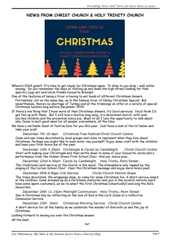 ProvidingNewsandViewsformorethan30yearsFoxPharmacy,HGHair&Page17theRennieGrovePeaceCharityShop.NEWSFROMCHRISTCHURCH&HOLYTRINITYCHURCHWhere%u2019s2024gone!?It%u2019stimetogetreadyforChristmasagain.Toshoptoyoudrop %u2013wellonline anyway.Do you remember the days of trolling up and down the high street looking for that specific Lego set and Uncle Franks favourite Brandy?OneofthefeaturesofbeingaVicarishavingtoeatloadsofdifferentChristmasdinners.Fortunately, not on the same day, as in the famous Vicar of Dibley Christmas Special.But nevertheless,there%u2019snoshortageofTurkeyandallthetrimmingsonofferatavarietyofspecial Christmas lunches long before December 25th!Ifthere%u2019sonethingthatIhavemoreof thanChristmasdinners,it%u2019sCarolservices.You%u2019dthink I%u2019d get fed up with them.But I still love a festive sing song, in a decorated church, with over excited children and the proverbial mince pie.Most of all I love the opportunity to talk about why Jesus is such good news for all people, everywhere, all the time.Wehaveaveritablefeastoffestivefareforyouthisyear.Justhavealookatthelotbelowand take your pick!December7th10-4pmChristmasTreeFestivalChristChurchCentreCome and see trees decorated by local groups and clubs to represent what they love about Christmas.Perhaps you mightliketoeven enter oneyourself!Enjoy somecraftwiththechildren and have your first mince pie of the year.December 15th 4.30pmChristingle & Carols by CandlelightChristChurchCentre Start with making your Christingle and then settle down to some of your favourite carols and a performance from the Holmer Green First School Choir. And yes, mince pies...December22nd4.30pmCarolsbyCandlelightHolyTrinity,PennStreetThetraditionalcarolserviceatthechurchinthewood.Theatmosphereonly toppedby the singingoftheCurzonSchoolChoir.HeartheChristmasmessageandenjoymoremincepies!December24th4.30pmCribServiceChristChurchHolmerGreenThetrees decorated,thewrappings done,socomefor someChristmas fun.Ashortserviceaimed at the children. Come dressed up as a Christmas character and join in the scratch nativity (we%u2019ll have some spare costumes), as we re-enact the first Christmas (chaotically!) and sing the kid%u2019s favourites.December 24th 11.15pm Midnight CommunionHoly Trinity, Penn Street Seein Christmas Day by reflecting onthelove of God in theLord Jesus ata reflective Communion Service.December25th10amChristmasMorningServiceChristChurchCentreAshortserviceforallthefamilyaswecelebratethewonderofGodwithusandthejoyofChristmas.LookingforwardtoseeingyouovertheChristmasseason. All the best,Daf