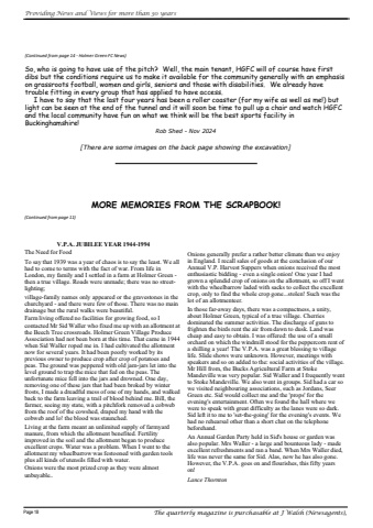 ProvidingNewsandViewsformorethan30yearsPage18ThequarterlymagazineispurchasableatJWalsh(Newsagents),(Continuedfrompage14-HolmerGreenFCNews)So, who is going to have use of the pitch?Well, the main tenant, HGFC will of course have first dibsbuttheconditionsrequireustomakeitavailableforthecommunitygenerallywithanemphasis on grassroots football, women and girls, seniors and those with disabilities.We already have trouble fitting in every group that has applied to have access.I have to say that the last four years has been a roller coaster (for my wife as well as me!) but lightcanbeseenattheendofthetunnelanditwillsoonbetimetopullupachair andwatchHGFC and the local community have fun on what we think will be the best sports facility in Buckinghamshire!RobShed-Nov2024[Therearesomeimagesonthebackpageshowingtheexcavation](Continuedfrompage11)MOREMEMORIESFROMTHESCRAPBOOK!V.P.A.JUBILEEYEAR1944-1994TheNeedforFoodTosaythat1939 wasayearofchaosistosaytheleast.Weall had to come to terms with the fact of war. From life in London, my family and I settled in a farm at Holmer Green -then a true village. Roads were unmade; there was no streetlighting;village-family namesonlyappeared orthegravestonesinthe churchyard andtherewerefewofthose.Therewasnomain drainage but the rural walks were beautiful.Farmlivingofferednofacilitiesforgrowingfood,soIcontactedMrSidWallerwhofixedmeupwithanallotmentat the Beech Tree crossroads. Holmer Green Village Produce Associationhad notbeenborn at thistime. That came in1944 when Sid Waller roped me in. I had cultivated the allotment now for several years. It had been poorly worked by its previous owner to produce crop after crop of potatoes and peas. The ground was peppered with old jam-jars let into the level ground to trap the mice that fed on the peas. The unfortunate mice fell into the jars and drowned. One day, removing one of these jars that had been broked by winter frosts,Imadeadreadfulmessofoneofmyhands,andwalked back to the farm leaving a trail of blood behind me. Bill, the farmer, seeing my state, with a pitchfork removed a cobweb from the roof of the cowshed, draped my hand with the cobweb and lo! the blood was staunched.Living at the farm meant an unlimited supply of farmyard manure, from which the allotment benefited. Fertility improved in the soil and the allotment began to produce excellent crops. Water was a problem. When I went to the allotmentmywheelbarrowwasfestoonedwithgardentools plus all kinds of utensils filled with water.Onionswerethemostprizedcropastheywerealmostunbuyable..Onions generally prefer a rather better climate than we enjoyin England. I recall sales of goods at the conclusion of our Annual V.P. Harvest Suppers when onions received the most enthusiastic bidding even a single onion! One year I had grownasplendidcropofonionsontheallotment,sooffIwent with the wheelbarrowladed with sacks to collect the excellent crop, only to find the whole crop gone...stolen! Such was the lot of an allotmenteer.In those faraway days, there was a compactness, a unity, about Holmer Green, typical of a true village. Cherries dominatedthe summeractivities.Thedischargeofgunsto frightenthebirdsrenttheairfromdawntodusk.Landwas cheap and easy to obtain. I was offered: the use of a smallorchardonwhichthewindmillstoodforthepeppercornrentof a shilling a year! The V.P.A. was a great blessing to village life. Slide shows were unknown. However, meetings with speakersandsoonaddedtothe:socialactivitiesofthevillage. Mr Hill from, the Bucks Agricultural Farm at StokeMandevillewasverypopular.SidWallerandIfrequentlywent to Stoke Mandeville. We also went in groups. Sid had a car so we visited neighbouring associations, such as Jordans, Seer Green etc. Sid would collect me and the 'props' for the evening's entertainment. Often we found the hall where we were to speak with great difficulty as the lanes were so dark.Sidleftittometo'set-the-going'fortheevening'sevents.We had no rehearsal other than a short chat on the telephone beforehand.An Annual Garden Party held in Sid's house or garden was also popular. Mrs Waller a large and bounteous lady made excellentrefreshmentsandranaband.WhenMrsWallerdied, life was never the same for Sid. Alas, now he has also gone.However,theV.P.A.goesonandflourishes,thisfiftyyearson!LanceThornton