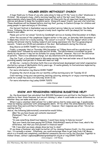 ProvidingNewsandViewsformorethan30yearsFoxPharmacy,HGHair&Page19theRennieGrovePeaceCharityShop.HOLMERGREENMETHODISTCHURCHAhugethank you tothoseof you whocame along tohelp us fillthe %u201cLovein aBox%u201d shoeboxes in October.We enjoyed a busy, chatty morning together and at the last count there was approximatelyninetybeautifullywrappedboxes,allfilledwiththeallimportanthandknittedhats, scarves and gloves to keep the recipients warm.Along with sweet treats, toys and vital toiletries. These shoeboxes will be blessed before starting their journey to Eastern Europe for children and young people to open and enjoy at Christmas.OurharvestfestivalinSeptemberwasanexcellentservicetakenbyourminister,RevRachael Prince.Following the service, we enjoyed a lovely lunch together with (as always) far too many desserts and cakes.Pleasejoinusforourannual%u201cCarolsbyCandlelightserviceonSunday22ndDecemberat6.00pm. After the success of the Lamphouse Singers earlier in the year, on Saturday 14th December at7.00pm.theyreturnfor alovelyevening.The concertisinaidof %u201cTheEveAppeal%u201d whichisthe leading UK national charity funding research and raising awareness into the five gynaecological cancers.Tickets are %u00a35.00 and available at the door.Refreshments during the interval.RingSharonon01494716897formoreinformation.Finally,areminderthatonThursday19thDecemberat7.00pmtherewillbeaproductionof %u201cA Christmas Carol%u201d followed by mince pies and hot drinks.This performance is excellent as given mainly by one person it may not be suitable for young children.However, this is at the discretion of parents.There is no admission charge, but any donations with be shared between:OneCanTrust-afood bankbasedinWycombeservingthetownandwiderareaofSouthBucks providing weekly food parcels to those who need our help.AllWeCan %u2013rootedinChristianfaiththisisaninternationaldevelopmentandrelieforganisation started by a group of Methodists thirty years ago.It works globally to find solutions impacted by disasters, poverty and injustice.FormoreinformationringSharon01494716897Ifpassingthechurchdopopintoourmonthlycoffeemorningevery1stTuesday10-12Craftmorning-bringyourownpainting,knittingcolouring,sewingetcorenjoyamorningmaking cards for a small fee every 3rd Saturday 10.00-12.30.FormoreinformationringLesley01494712072LesleyOrangeKNOWANYPENSIONERSNEEDINGBUDGETINGHELP?So, the Government has calculated that 800,000 Pensioners are entitled to the Pension Credit additiontotheirStatePensions,butarenotclaimingit,whenitcouldmakesomuchdifferenceto whether they can make ends meet, or not.When I was a volunteer debt adviser for a debt advice charity some years ago, I would sometimes be helping a pensioner with unmanageabledebts.All too often the online Benefits Checker wouldshowtheywereentitledtoPensionCredit.However,their responsewasoften: %u201cI%u2019mnotaccepting charity.%u201dAndso,thefollowing(abbreviated)conversationwouldfollow... (Me) %u201cDo you have house and contents insurance?%u201d (Pensioner) %u201cYes, of course%u201d%u201cWhy?%u201d%u201cIncasesomethingdisastroushappens,Iwouldhavemoneytohelpme recover%u201d%u201cButyourfamilyhasbeenpayingNATIONALINSURANCEnearlyalltheirlives,what%u2019sthe difference, now that you find yourself in financial need?%u201d%u201cOK,Iseewhatyoumean,pleaseshowmehowtoclaim%u201dIf you know a Pensioner who might be better off by claiming Pension Credit, try this conversation %u2013it%u2019s normally a winner.Otherwise, you could encourage them to get help from CAP Money, whichisafriendlyandcompletelyconfidentialcommunityservicerunbytheChurchesTogetherin Holmer Green, contact capmoney@holmergreenbaptist.org.ukor ring 01494 712479.ChrisGregory -CAPMoney