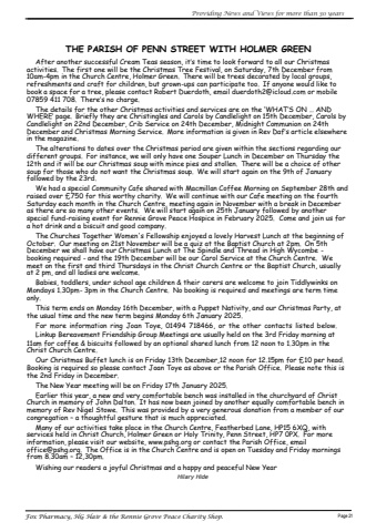 ProvidingNewsandViewsformorethan30yearsFoxPharmacy,HGHair&Page21theRennieGrovePeaceCharityShop.THEPARISHOFPENNSTREETWITHHOLMERGREENAfter another successful Cream Teas season, it%u2019s time to look forward to all our Christmas activities.The first one will be the Christmas Tree Festival, on Saturday, 7th December from 10am-4pm in the Church Centre, Holmer Green.There will be trees decorated by local groups, refreshments andcraftfor children,butgrown-ups can participatetoo.If anyonewouldliketo bookaspaceforatree,pleasecontactRobertDuerdoth,emailduerdoth2@icloud.comormobile 07859 411 708.There%u2019s no charge.The details for the other Christmas activities and services are on the %u2018WHAT%u2019S ON %u2026 AND WHERE%u2019 page.Briefly they are Christingles and Carols by Candlelight on 15th December, Carols by Candlelight on 22nd December, Crib Service on 24th December, Midnight Communion on 24th DecemberandChristmasMorningService.MoreinformationisgiveninRevDaf%u2019sarticleelsewhere in the magazine.Thealterationstodatesover theChristmasperiodaregivenwithinthesectionsregardingour different groups.For instance, we will only have one Souper Lunch in December on Thursdaythe 12thanditwillbeour Christmassoupwithmincepiesandstollen.Therewillbeachoice of other soup for those who do not want the Christmas soup.We will start again on the 9th of January followed by the 23rd.WehadaspecialCommunityCafesharedwithMacmillanCoffeeMorningonSeptember28thand raised over %u00a3750 for this worthy charity.We will continue with our Cafe meeting on the fourth Saturday each month in the Church Centre, meeting again in November with a break in Decemberas there are so many other events.We will start again on 25th January followed by anotherspecial fund-raising event for Rennie Grove Peace Hospice in February 2025.Come and join us for a hot drink and a biscuit and good company.TheChurchesTogetherWomen'sFellowshipenjoyedalovelyHarvestLunchatthebeginningof October.Our meeting on 21st November will be a quiz at the Baptist Church at 2pm.On 5th December we shall have our Christmas Lunch at The Spindle and Thread in High Wycombe -booking required -and the 19th December will be our Carol Service at the Church Centre.We meet on the first and third Thursdays in the Christ Church Centre or the Baptist Church, usually at 2 pm, and all ladies are welcome.Babies,toddlers,underschoolagechildren&their carersarewelcometojoinTiddlywinkson Mondays1.30pm-3pmintheChurchCentre.Nobookingisrequiredandmeetingsaretermtime only.ThistermendsonMonday16thDecember,withaPuppetNativity,andour ChristmasParty,at the usual time and the new term begins Monday 6th January 2025.For more information ring Joan Toye, 01494 718466, or the other contacts listed below. LinkupBereavementFriendshipGroupMeetingsareusuallyheldonthe3rdFridaymorningat11amforcoffee&biscuitsfollowedbyanoptionalsharedlunchfrom12noonto1.30pminthe Christ Church Centre.Our Christmas Buffetlunchis onFriday 13thDecember,12noonfor 12.15pm for %u00a310per head. BookingisrequiredsopleasecontactJoanToyeasaboveortheParishOffice.Pleasenotethisis the 2nd Friday in December.TheNewYearmeetingwillbeonFriday17thJanuary2025.Earlier this year, a new and very comfortable bench was installed in the churchyard of Christ ChurchinmemoryofJohnDalton.Ithasnowbeenjoinedbyanotherequallycomfortablebenchin memoryof RevNigelStowe.This wasprovidedbyaverygenerousdonationfromamember of our congregation %u2013a thoughtful gesture that is much appreciated.Many of our activities take place in the Church Centre, Featherbed Lane, HP15 6XQ, with services held in Christ Church, Holmer Green or Holy Trinity, Penn Street, HP7 0PX.For more information, please visit our website, www.pshg.orgor contact the Parish Office, email office@pshg.org.TheOfficeisintheChurchCentreandisopenonTuesdayandFridaymornings from 8.30am %u201312,30pm.WishingourreadersajoyfulChristmasandahappyandpeacefulNewYearHilaryHide