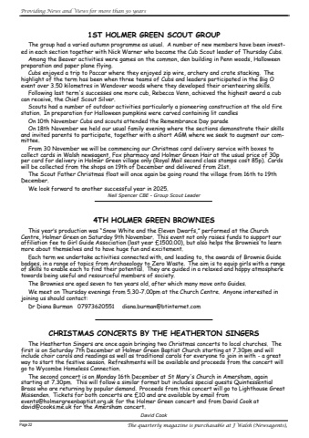 ProvidingNewsandViewsformorethan30yearsPage22ThequarterlymagazineispurchasableatJWalsh(Newsagents),1STHOLMERGREENSCOUTGROUPThegrouphadavariedautumnprogrammeasusual.AnumberofnewmembershavebeeninvestedineachsectiontogetherwithNickWarnerwhobecametheCubScoutleaderofThursdayCubs.Among theBeaver activitiesweregamesonthecommon,den buildinginPennwoods,Halloween preparation and paper plane flying.Cubs enjoyed a trip toPaccar wherethey enjoyedzip wire,archery and cratestacking.The highlightof thetermhasbeenwhenthreeteamsof CubsandleadersparticipatedintheBigO event over 3.50 kilometres in Wendover woods where they developed their orienteering skills.Following lastterm's successes onemorecub, Rebecca Venn,achievedthehighest award a cub can receive, the Chief Scout Silver.Scouts hadanumber ofoutdoor activitiesparticularlyapioneeringconstructionattheoldfire station.In preparation for Halloween pumpkins were carved containing lit candlesOn10thNovemberCubsandscoutsattendedtheRemembranceDayparadeOn18thNovember weheldour usualfamilyeveningwherethesectionsdemonstratetheir skills andinvitedparents toparticipate,together withashortAGM whereweseek toaugment our committee.From 30 November we will be commencing our Christmas card delivery service with boxes to collect cards in Walsh newsagent, Fox pharmacy and Holmer Green Hair at the usual price of 30p percardfordeliveryinHolmerGreenvillageonly(RoyalMailsecondclassstampscost85p).Cards will be collected from the shops on 19th of December and delivered from 21st.TheScoutFather Christmas floatwillonce again begoing round thevillage from16thto 19th December.Welookforwardtoanother successfulyear in2025.NeilSpencerCBE -GroupScoutLeader4THHOLMERGREENBROWNIESThis year%u2019s production was %u201cSnow White and the Eleven Dwarfs,%u201d performed at the Church Centre,HolmerGreenonSaturday9thNovember.Thiseventnotonly raisesfundstosupportour affiliation feeto Girl GuideAssociation (last year %u00a31500.00), but also helps theBrownies to learn more about themselves and to have huge fun and excitement.Each term we undertake activities connected with, and leading to, the awards of Brownie Guide badges,inarangeof topicsfromArchaeologytoZeroWaste.Theaimistoequipgirlswitharange of skills to enable each to find their potential.They are guided in a relaxed and happy atmosphere towards being useful and resourceful members of society.TheBrowniesareagedseventoten yearsold,after whichmanymoveontoGuides.WemeetonThursdayeveningsfrom5.30-7.00pmattheChurchCentre.Anyoneinterestedin joining us should contact:DrDianaBurman07973620551diana.burman@btinternet.comCHRISTMASCONCERTSBYTHEHEATHERTONSINGERSThe Heatherton Singers are once again bringing two Christmas concerts to local churches.The first is on Saturday 7th December at Holmer Green Baptist Church starting at 7.30pm and will include choir carols and readings as well as traditional carols for everyone to join in with -a great waytostartthefestiveseason.Refreshmentswillbeavailableandproceedsfromtheconcertwill go to Wycombe Homeless Connection.The second concert is on Monday 16th December at St Mary's Church in Amersham, again starting at 7.30pm.This will follow a similar format but includes special guests Quintessential Brasswhoarereturningbypopulardemand.ProceedsfromthisconcertwillgotoLighthouseGreat Missenden.Tickets for both concerts are %u00a310 and are available by email from events@holmergreenbaptist.org.ukfor the Holmer Green concert and from David Cook at david@cooks.me.ukfor the Amersham concert.DavidCook