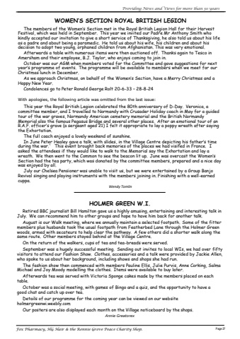 ProvidingNewsandViewsformorethan30yearsFoxPharmacy,HGHair&Page27theRennieGrovePeaceCharityShop.WOMEN%u2019SSECTIONROYALBRITISHLEGIONThe members of the Women%u2019s Section met in the Royal British Legion Hall for their Harvest Festival, which was held in September.This year we invited our Padre Mr Anthony Smith who kindlyacceptedour invitationtogiveashortserviceofThanksgiving,healsotoldusabouthislife as a padre and about being a paramedic.He told us about his wife, his children and about his decision to adopt two young, orphaned children from Afghanistan. This was very emotional.Afterwardsatablewithnumerousitemswerethenauctionedoff.ThanksagaintoTescoin Amersham and their employee, B.J. Taylor, who enjoys coming to join in.OctoberwasourAGMwhenmembersvotedfortheCommitteeandgavesuggestionsfornext year%u2019s programmeof events.Theprogrammewillbeavailabletomembers whenwemeetfor our Christmas lunch in December.AsweapproachChristmas,onbehalfofthe Women%u2019sSection,haveaMerryChristmasanda Happy New Year.CondolencesgotoPeterRonaldGeorgeRolt20-6-33%u201328-8-24Withapologies,thefollowingarticlewasomittedfromthelastissue:This year the Royal British Legion celebrated the 80th anniversary of D-Day.Veronica, a committeemember,andItravelledtoNormandywithCrusaderHolidaycoachinMayforaguided tour of the war graves, Normandy American cemetery memorial and the British Normandy MemorialalsothefamousPegasusBridgeandseveralotherplaces.AfteranemotionaltourofanR.A.F.officer%u2019sgrave(asergeantaged21)Ifeltitappropriatetolayapoppywreathaftersaying the Exhortation.Thefullcoachenjoyedalovelyweekendofsunshine.In June Peter Healey gave a talk, with slides, in the Village Centre depicting his father%u2019s time during the war.`This event brought back memories of the places we had visited in France.I asked the attendees if they would like to walk to the Memorial say the Exhortation and lay a wreath.We then went to the Common to see the beacon lit up.June was overcast the Women%u2019s Sectionhadtheteaparty,whichwasdonatedbythecommittee members,preparedandaniceday was enjoyed by all.July our Chelsea Pensioner was unable to visit us, but we were entertained by a Group Banjo Revivalsingingandplayinginstrumentswiththemembersjoiningin.Finishingwithawell-earned cuppa.WendyTomlinHOLMERGREENW.I.RetiredBBCjournalistBillHamiltongaveusahighlyamusing,entertainingandinterestingtalkin July.We can recommend him to other groups and hope to have him back for another talk.AugustisourWalkmeeting,whereweannuallymaintainaselectedfootpath.Someofthefitter members plus husbands took the usual footpath from Featherbed Lane through the Holmer Green woods, armed with secateurs to help clear the pathway.A few others did a shorter walk along the same route.Other members stayed behind at the Village Centre.Onthereturnofthewalkers,cupsofteaandtea-breadswereserved.September wasahugelysuccessfulmeeting.Sending outinvitestolocalWIs,wehadover fifty visitorstoattendour FashionShow.Clothes,accessoriesandatalkwereprovidedbyJackieAllen, who spoke to us about her background, including shows and shops she had run.Thefashionshowthencommenced withmembersPaulineEllis,JuliePurvis,AnneCorking,Salma Michael and Joy Moody modelling the clothes.Items were available to buy later.AfterwardsteawasservedwithVictoriaSpongecakesmadebythemembersplacedoneach table.Octoberwasasocialmeeting,withgamesofBingoandaquiz,andtheopportunitytohaveagoodchatandcatchupovertea.Detailsofourprogrammeforthecomingyearcanbeviewedonourwebsite holmergreenwi.weebly.comOurpostersarealsodisplayedeachmonthontheVillagenoticeboardbytheshops.AnnieGreatorex