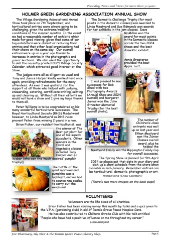 ProvidingNewsandViewsformorethan30yearsFoxPharmacy,HGHair&Page31theRennieGrovePeaceCharityShop.HOLMERGREENGARDENINGASSOCIATIONANNUALSHOWThe Village Gardening Association%u2019s Annual Show took place on 7th September, and horticultural entries were always going to be challenging. given the extreme weather conditions of the summer months.In the event we had a reasonable number of exhibits which made for good viewing, given that some of our big exhibitors were absent or reducing their entries and that other local organisations had their shows on the same day.Our overall entries were up on a year ago thanks to increases in entries in the photographic and junior sections.We also used the opportunitytoselltherecentlyprinted2025VillageSociety Calendar, which attracted good interest at the Show.The judges were all as diligent as usual and TonyandJaniceHarperkindlyworkedhardonce again, providing refreshments for the many attendees.As ever I was grateful for the support of all those who helped with judging, stewarding,catering,certificatewriting,setting up and clearing up.Without all their efforts we wouldnothaveashowandIgivemyhugethanks to them all.PeterWilliamsistobecongratulatedonhis many wonderful horticultural successes.The Royal Horticultural Society (RHS) Medal went however, to Linda Meatyard as RHS rules prevent Peter from winning 2 years in a row.BrianFisher,ourresidenthorticulturist,wasthewinner of The Best pot plant for one of his superb succulents.Other winners in the floral and vegetable classes included Tony Harper and JoWeber(whowonthe%u2018much-desired%u2019pumpkintrophy!).The battle of the giant marrows and pumpkins was a highlight.andwehad to source new scales to carry out the weigh-ins!The Domestic Challenge Trophy (for most pointsinthedomesticclasses)wasawardedto Linda Meatyard and Sue Edmunds won awards for her exhibits in the jam classes.DaveMcMillan won the award for most points intheDomesticclasses across the two 2024 shows and the best domestic exhibit.Annie Greatorex providedthebest Apple Tart.Iwaspleasedtosee successes for Rob Shed with two Photography Awards (AnnualShowand2024 overall) and Margaret James won the John Streeter Memorial Trophy (for the best overall photo).Thenumberof Children%u2019s class entrants was well uponlastyearand Ethan Meatyard won the Junior Classes overall award, plus he helped theMeatyardfamilywintheRippingtonFamilyCupforoverallsuccesses.TheSpringShowisplannedfor5thApril 2024 so please put that date in your diary and pickup a show schedule from the store when availableinmid-January.Rememberentriescan be horticultural, domestic, photographic or art.MichaelKing(ShowSecretary)[There%u2019stwomoreimagesonthebackpage]VOLUNTEERSVolunteersarethelifebloodofallcharities.BrianFisher hasbeenraisingmoneythismonthbytalksandaquizgivento the V.P.A. (gardening club) in aid of Rennie Grove Peace Hospice Care.HehasalsocontributedtoChilternStrokeClubwithhistalkentitled%u201cPeoplewhohavehadapositiveinfluenceonmethroughoutmycareer.%u201dLindaMeatyard