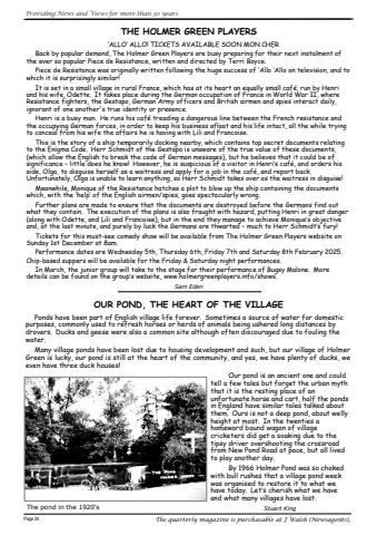 ProvidingNewsandViewsformorethan30yearsPage34ThequarterlymagazineispurchasableatJWalsh(Newsagents),THEHOLMERGREENPLAYERS%u2018ALLO%u2019ALLO!TICKETSAVAILABLESOONMONCHERBackbypopulardemand,TheHolmer GreenPlayersarebusypreparingfor their nextinstalmentof the ever so popular Piece de Resistance, written and directed by Terri Boyce.PiecedeResistancewasoriginallywrittenfollowingthehugesuccessof %u2018Allo%u2018Alloontelevision,andto which it is surprisingly similar!It is setin asmall villagein rural France, whichhas at its heart an equallysmall caf%u00e9,run byHenri andhiswife,Odette.IttakesplaceduringtheGermanoccupationofFranceinWorldWar II,where Resistance fighters, the Gestapo, German Army officers and British airmen and spies interact daily, ignorant of one another's true identity or presence.Henri is a busy man.He runs his caf%u00e9 treading a dangerous line between the French resistance and theoccupyingGermanforces,inorder tokeephisbusinessafloatandhislifeintact,allthewhiletrying to conceal from his wife the affairs he is having with Lili and Francoise.Thisisthestoryofashiptemporarilydockingnearby,whichcontainstopsecretdocumentsrelating to the Enigma Code.Herr Schmidt of the Gestapo is unaware of the true value of these documents, (which allow the English to break the code of German messages), but he believes that it could be of significance %u2013little does he know!However, he is suspicious of a visitor in Henri%u2019s caf%u00e9, and orders his aide, Olga, to disguise herself as a waitress and apply for a job in the caf%u00e9, and report back.Unfortunately,Olgaisunabletolearnanything,soHerrSchmidttakesoverasthewaitressindisguise!Meanwhile,MoniqueoftheResistancehatchesaplottoblowuptheshipcontainingthedocuments which, with the %u2018help%u2019 of the English airmen/spies, goes spectacularly wrong.Further plans are made to ensure that the documents are destroyed before the Germans find out whattheycontain.Theexecutionoftheplansisalsofraughtwithhazard,puttingHenriingreatdanger (along with Odette, and Lili and Francoise), but in the end they manage to achieve Monique%u2019s objective and, at the last minute, and purely by luck the Germans are thwarted %u2013much to Herr Schmidt%u2019s fury!Ticketsfor thismust-seecomedyshowwillbeavailablefromTheHolmerGreenPlayerswebsiteon Sunday 1st December at 8am.PerformancedatesareWednesday5th,Thursday6th,Friday7thandSaturday8thFebruary2025.Chip-basedsupperswillbeavailablefortheFriday&Saturdaynightperformances.InMarch,thejuniorgroupwilltaketothestagefor their performanceofBugsyMalone.More details can be found on the group%u2019s website, www.holmergreenplayers.info/shows.SamEdenOURPOND,THEHEART OFTHEVILLAGEPondshavebeenpartof Englishvillagelifeforever.Sometimesa sourceof water for domestic purposes, commonly used to refresh horses or herds of animals being ushered long distances by drovers.Ducks and geese were also a common site although often discouraged due to fouling the water.Manyvillagepondshavebeenlostduetohousingdevelopmentandsuch,butour villageof Holmer Green is lucky, our pondis still at the heart of the community, and yes, we have plenty of ducks, we even have three duck houses!Thepondinthe1920%u2019sOur pond is an ancient one and could tell a few tales but forget the urban myth that it is the resting place of an unfortunatehorseandcart,halftheponds in England have similar tales talked about them.Oursisnotadeeppond,aboutwelly height at most.In the twenties a homeward bound wagon of village cricketers did get a soaking due to the tipsy driver overshooting the crossroad from New Pond Road at pace, but all lived to play another day.By1966HolmerPondwassochoked with bull rushes that a village pond week was organised to restore it to what we have today.Let%u2019s cherish what we have and what many villages have lost.StuartKing