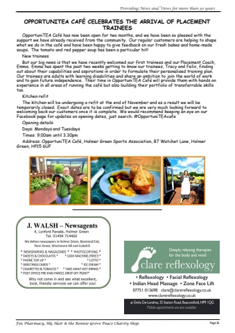 ProvidingNewsandViewsformorethan30yearsFoxPharmacy,HGHair&Page35theRennieGrovePeaceCharityShop.OPPORTUNITEACAF%u00c9CELEBRATESTHEARRIVALOFPLACEMENT TRAINEESOpportuniTEA Caf%u00e9 has now been open for two months, and we have been so pleased with the supportwehavealreadyreceivedfromthecommunity.Our regularcustomersarehelpingtoshape what we do in the caf%u00e9 and have been happy to give feedback on our fresh bakes and homemade soups.The tomato and red pepper soup has been a particular hit!NewtraineesBut our big news is thatwe have recently welcomed our first trainees and our Placement Coach, Emma.Emma has spent the past two weeks getting to know our trainees, Tracy and Felix, finding out about their capabilities and aspirations in order to formulate their personalised training plan. Our trainees are adults with learning disabilities and share an ambition to join the world of work andtogainfutureindependence.Their timeinOpportuniTEACaf%u00e9willprovidethemwithhandson experience in all areas of running the caf%u00e9 but also building their portfolio of transferrable skills too.KitchenrefitThe kitchen will be undergoing a refit at the end of November and as a result we will be temporarily closed.Exact dates are to be confirmed but we are very much looking forward to welcomingbackour customersonceitiscomplete.Wewouldrecommendkeepinganeyeonour Facebook page for updates on opening dates, just search: #OpportuniTEAcafeOpeningdetailsDays:MondaysandTuesdays Times: 9.00am until 3.30pmAddress:OpportuniTEACaf%u00e9,HolmerGreenSportsAssociation,87WatchetLane,Holmer Green, HP15 6UF