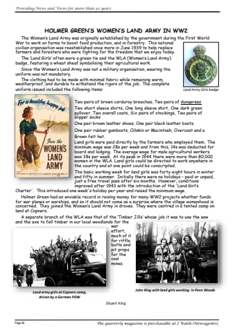 ProvidingNewsandViewsformorethan30yearsPage36ThequarterlymagazineispurchasableatJWalsh(Newsagents),HOLMERGREEN%u2019SWOMEN%u2019SLANDARMYINWW2TheWomen%u2019sLandArmywasoriginallyestablishedbythegovernmentduringtheFirstWorld War to work on farms to boost food production, and in forestry.This nationalcivilian organisation was reestablished once more in June 1939 to help replace farmersandforesterswhowerefightingforthefreedomthatweenjoytoday.The%u2019LandGirls%u2019oftenworeagreentieandtheWLA(Women%u2019sLandArmy) badge, featuring a wheat sheaf symbolising their agricultural work.SincetheWomen%u2019sLandArmywasnotamilitaryorganisation,wearingthe uniform was not mandatory.The clothing had to be made with minimal fabric while remaining warm, weatherproof,anddurabletowithstandtherigorsofthejob.Thecompleteuniformissuedincludedthefollowingitems:LandArmyGirlsbadgeTwopairsofbrowncorduroybreeches,Twopairsof dungareesTwo short sleeve shirts, One long sleeve shirt, One dark green pullover,Twooverallcoats,Sixpairsofstockings,Twopairsof slipper socksOnepairbrownleathershoes,Onepairblackleatherboots.Onepairrubbergumboots,OilskinorMacintosh,Overcoatanda Brown felt hat.Landgirlswerepaiddirectlybythefarmerswhoemployedthem.The minimum wage was 28s per week and from this, 14s was deducted for board and lodging.The average wage for male agricultural workers was 38s per week.At its peak in 1944 there were more than 80,000 women in the WLA. Land girls could be directed to work anywhere in the country and at one point could be conscripted.Thebasic working weekfor land girls was forty-eighthours in winter andfiftyinsummer.Initiallytherewerenoholidays%u2013paidorunpaid, just a free travel pass after six months.However, conditions improved after 1943 with the introduction of the 'Land Girl%u2019sCharter'.Thisintroducedoneweek'sholidayperyearandraisedtheminimumwage.Holmer Green had an enviable record in raising money for many WW2 projects whether funds for war planes or warships, and so it should not come as a surprise where the village womanhood is concerned.Theyjoined theWomen%u2019sLandArmyindroves.Theywerecentredinatented campon land at Copners.Aseparatebranchof theWLAwasthatof the%u2018Timber Jills%u2019 whosejobitwastousethesaw and the axe to fell timber in our local woodlands for thewar effort, muchofit for riffle butts and pit props for the coalmines.LandarmygirlsatCopnerscamp,drivenbyaGermanPOWStuartKingJohnKingwithlandgirlsworkinginPennWoods