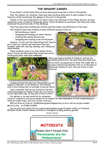 ProvidingNewsandViewsformorethan30yearsFoxPharmacy,HGHair&Page39theRennieGrovePeaceCharityShop.THESENSORYGARDENIfyouhaven%u2019tvisitedlatelythenyouhavesomegreatsurprisesinstoreatthegarden.Overthesummerour volunteerteamhavebeenworkingreallyhardtoaddanumberofnew features, whilst maintaining the upkeep of the rest of the garden.Thanks to the recruiting efforts of Simon Jones, the Chairman of the Village Society, we have welcomedateamofDukeofEdinburghSeniorSchoolStudentsasvolunteers,andtheyhavereally embraced the practical side of this challenge.Theyhavebeenhardworkingandcreativeandhavemadeabigdifferencetotheteam. The students have been working on many different projects such as:%u2022Refurbishingourbench%u2022Designingandbuildingourwaterfeature%u2022Creatingthesundialfeatureand%u2022DesigningandcreatinganewtactileboardHowever,it%u2019snotjusttheinterestingstuffthey%u2019ve put a hand too, they%u2019ve also embraced the more mundane tasks like clearing, weeding, leaf raking and dead heading.These students come to us from Holmer Green SeniorSchoolandWycombeHighSchoolandcanbe found giving their time most weekends.They have been a breath of fresh air, and we are incrediblygratefulfortheworktheyhavedonehere.If you haveayoung personathome that mightliketo dosomevolunteering(whetherthatisviatheDukeof Edinburgh Scheme or not), then we'd love to hear from you.Looking forward into the next few months we are hoping to take part in Christmas by The Common, withafundraisingstall,sowehopetoseeyouthere.Just a reminder that we are located on the Earl HoweRoad(oppositeHolmerGreenServiceCentre), we are open every day, all day and is free to enter.Ourgardenisrunandcaredforbyvolunteersfromourcommunityandwearealwaysonthelookoutfornewvolunteers.Ifthisissomethingyouthinkyoumightenjoy,we%u2019dlovetohearfromyou.Whynotdropusalineat:info@holmergreenvillagesociety.co.ukorcallourprojectleader-MartinLittle%u2013on07384633259.Youcanstayuptodatewithoureventsandprogressonsocialmedia,eitheronFacebook: @Holmer Green Jubilee Sensory Garden or Instagram at @hg_sensory_garden.SarahCrownerMOTORISTSPleasedon%u2019tforgetthat Pavements are for Pedestrians!