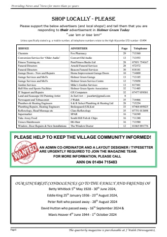 ProvidingNewsandViewsformorethan30yearsPage6ThequarterlymagazineispurchasableatJWalsh(Newsagents),SHOPLOCALLY-PLEASEPleasesupportthebelowadvertisers(andlocalshops!)andtellthemthatyouare responding to their advertisement in Holmer Green Today%u201cuse%u2019emorlose%u2019em!%u201dSERVICEADVERTISERPageTelephoneChemistsFoxPharmacy29713360ConversionServicefor%u2018OlderAudio%u2019ConvertOldAudio13713553FitnessTrainingetc.PureFitnessBucksLtd2807851754167FuneralDirectorsArnoldFuneralServices28472572FuneralDirectorsBeaconFuneralServices30818181GarageDoorsNewandRepairsHomeImprovementGarageDoors10714809GarageServicesandMoTsHolmerGreenGarage13713185GarageServicesandMoTsHolmerGreenServiceCentre12715058GardenServicesMike%u2019sGardenServices13817441HallHireandSportsFacilitiesHolmerGreenSportsAssociation32711485ITSupportandRepairsGXComputers3207477059381LandandSeascapeOilPaintingArtistJoEarlArtjoearlart@gmail.com8NewsagentandTobacconistJ Walsh35714466Plumbers&HeatingEngineersS&RSelectPlumbing&HeatingLtd28715254PlumbingRepairs,HeatingEngineersBoilerguard(UK)Ltd3307468695025Reflexology,HeadMassageetcClareReflexology3507751013698SupermarketSPAR16716549TakeAwayFoodSouthHillFish&Chips16711240UnisexHairdressersHGHair16713580Window,DoorRepairs&NewInstallationsTheWindowDoctor1201865891776PLEASEHELPTOKEEPTHEVILLAGECOMMUNITYINFORMED!AN ADMINCO-ORDINATOR AND ALAYOUTDESIGNER/TYPESETTER ARE URGENTLY REQUIRED TO JOIN THE MAGAZINE TEAM.FORMOREINFORMATION,PLEASECALLANNON01494715483OURSINCERESTCONDOLENCESGOTOTHEFAMILYANDFRIENDSOFBetty Whitlock 5thMay 1928 -30thJune 2024, EddieKing25thJanuary1936-23rdAugust2024, Peter Rolt who passed away -28thAugust 2024DavidHuttonwhopassedaway-16thSeptember2024& Mavis Heaver 4thJune 1944 -1stOctober 2024