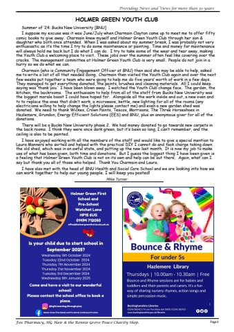 ProvidingNewsandViewsformorethan30yearsFoxPharmacy,HGHair&Page9theRennieGrovePeaceCharityShop.HOLMERGREENYOUTHCLUBSummerof%u201924:BucksNewUniversity[BNU]I suppose my excuse wasit was June/July when Charmain Clayton came upto meet me to offer fifty comic books to give away.Charmain knew myself and Holmer Green Youth Club through her son & daughter who both once attended.When I was asked about my summer break, I was probably not very enthusiastic asit%u2019s the time I try todosome maintenanceor painting.Time and moneyfor maintenance will always hold me back but I do what I can do.I try to take some of the wear and tear away, making theYouthClubawelcomingplacetovisit.Thesejobsoverthesummeroftenfeellikecoveringoverthe cracks.The management committee at Holmer Green Youth Club is very small.People do not join in a hurry so we do what we can.Charmain (who is Community Engagement Officer at BNU) then said she may be able to help, askedmetowritealistofallthatneededdoing.CharmainthenvisitedtheYouthClubagainandover thenext few weeks put together a team who were going to help me do five years%u2019 worth of work in a few days.They managed to get everything donated, the paints, brushes and cleaning materials.All I could keep sayingwas%u2018thankyou.%u2019Ihavebeenblownaway.IwatchedtheYouthClubchangeface.Thegarden,the kitchen, the backrooms.The enthusiasm to help from all of the staff from Bucks New University was the biggest morale boost I could have hoped for.Alongside all the work inside and out, a new oven and tv to replace the ones that didn%u2019t work, a microwave, kettle, new lighting for all of the rooms (any electricians willing to help change the lights please contact me) and even a new garden shed wasdonated.We need to thank Wickes, Crown Paints, Tescos, Morrisons, The Three Horseshoes in Hazlemere, Grundon, Energy Efficient Solutions (EES) and BNU, plus an anonymous giver for all of the donations.TherewillbeaBucksNewUniversityphase2.Wehadmoneydonatedtogotowardsnewcarpetsin the back rooms.I think they were once dark green, but it%u2019s been so long, I can%u2019t remember, and the ceiling is also to be painted.I have enjoyed working with all the members of the staff and would liketo give a special mention to Laura Manners who sorted and helped with the practical DIY I cannot do and took charge taking down the old shed, which was in an awful state, and putting up the new last month.It is now my job to make useofwhathasbeengiven,bothtimeanddonations.ButIguessthebiggestthingIhavebeengivenis a feeling that Holmer Green Youth Club is not on its own and help can be out there.Again, what can I say but thank you all of those who helped.Thank You Charmain and Laura.IhavealsometwiththeheadofBNUHealthandSocialCareSchoolandweare lookingintohowwe can work together to help our young people. I will keep you posted!MikeTurner