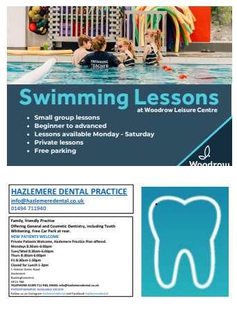 woodrowhighhouse.org01494 433531Swimming Lessonsat Woodrow Leisure CentreSmall group lessonsBeginner to advancedLessons available Monday - SaturdayPrivate lessonsFree parkingHAZLEMERE DENTAL PRACTICEinfo@hazlemeredental.co.uk01494 711940 Family, friendly Practice Offering General and Cosmetic Dentistry, including Tooth Whitening. Free Car Park at rear. NEW PATIENTS WELCOME Private Patients Welcome, Hazlemere Practice Plan offered. Mondays 8:30am-6:00pm Tues/Wed 8:30am-6.00pm Thurs 8:30am-6:00pm Fri 8:30am-1.00pm Closed for Lunch 1-2pm 1 Holmer Green Road Hazlemere Buckinghamshire HP15 7BB TELEPHONE 01494 711 940; EMAIL-info@hazlemeredental.co.ukPHYSIOTHERAPIST AVAILABLE ON SITE Follow us on Instagram hazlemeredental and Facebook hazlemeredental