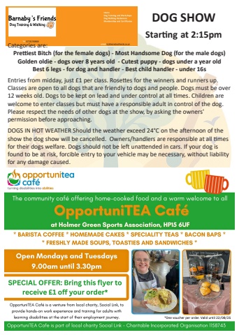 DOG SHOW Startingat 2:15pmCategories are:Prettiest Bitch (for the female dogs) - Most Handsome Dog (for the male dogs)Golden oldie - dogs over 8 years old - Cutest puppy - dogs under a year oldBest 6 legs - for dog and handler - Best child handler - under 16sEntries from midday, just %u00a31 per class. Rosettes for the winners and runners up.Classes are open to all dogs that are friendly to dogs and people. Dogs must be over12 weeks old. Dogs to be kept on lead and under control at all times. Children arewelcome to enter classes but must have a responsible adult in control of the dog.Please respect the needs of other dogs at the show, by asking the owners'permission before approaching.DOGS IN HOT WEATHER Should the weather exceed 24%u00b0C on the afternoon of theshow the dog show will be cancelled. Owners/handlers are responsible at all timesfor their dogs welfare. Dogs should not be left unattended in cars. If your dog isfound to be at risk, forcible entry to your vehicle may be necessary, without liabilityfor any damage caused.