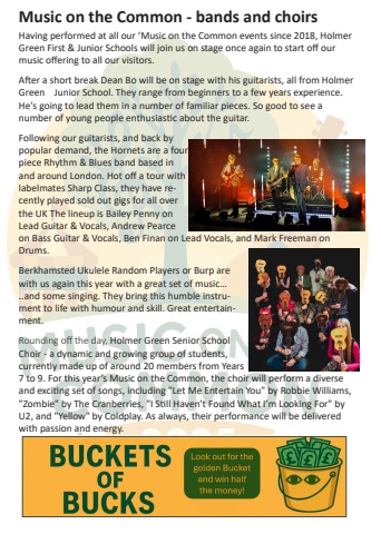 Music on the Common - bands and choirsHaving performed at all our %u2018Music on the Common events since 2018, HolmerGreen First & Junior Schools will join us on stage once again to start off ourmusic offering to all our visitors.After a short break Dean Bo will be on stage with his guitarists, all from HolmerGreen Junior School. They range from beginners to a few years experience.He's going to lead them in a number of familiar pieces. So good to see anumber of young people enthusiastic about the guitar. Following our guitarists, and back bypopular demand, the Hornets are a fourpiece Rhythm & Blues band based inand around London. Hot off a tour withlabelmates Sharp Class, they have recently played sold out gigs for all overthe UK The lineup is Bailey Penny onLead Guitar & Vocals, Andrew Pearceon Bass Guitar & Vocals, Ben Finan on Lead Vocals, and Mark Freeman onDrums.Berkhamsted Ukulele Random Players or Burp arewith us again this year with a great set of music%u2026..and some singing. They bring this humble instrument to life with humour and skill. Great entertainment. Rounding off the day, Holmer Green Senior SchoolChoir - a dynamic and growing group of students, currently made up of around 20 members from Years7 to 9. For this year%u2019s Music on the Common, the choir will perform a diverseand exciting set of songs, including \\ by The Cranberries, \U2, and \with passion and energy.