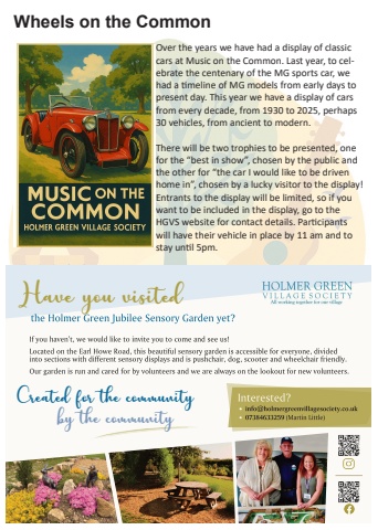 Wheels on the CommonOver the years we have had a display of classiccars at Music on the Common. Last year, to celebrate the centenary of the MG sports car, wehad a timeline of MG models from early days topresent day. This year we have a display of carsfrom every decade, from 1930 to 2025, perhaps30 vehicles, from ancient to modern. There will be two trophies to be presented, onefor the %u201cbest in show%u201d, chosen by the public andthe other for %u201cthe car I would like to be drivenhome in%u201d, chosen by a lucky visitor to the display!Entrants to the display will be limited, so if youwant to be included in the display, go to theHGVS website for contact details. Participantswill have their vehicle in place by 11 am and tostay until 5pm.Have you visited Created for %u7400e communityby %u7400e community