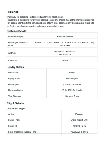 HiHarishThankyouforchoosingTeletextHolidaysforyournextholiday!PleasetakeamomenttoreviewyourbookingdetailsandensurethatalltheinformationiscorrecPayspecialattentiontothenamesanddateofbirthlistedbelow,asanydiscrepanciesfoundafteconfirmingyourbookingmayincurchargesorcancellationfees.CustomerDetails:LeadPassengerHarishBommenaPassengerNames&DOBHarish-12/12/1982,Stella-12/12/1983,John-07/06/2024,Tony12/12/1984AddressHyderabad,Hyderabad+441234567PostCode12345HolidayDetails:DestinationAntalyaFlyingFromBristolAirportPassengers3Adults,1ChildrenDepartureDates15Jul2025for1nightTourOperatorDynamicToursFlightDetails:OutboundFlightAirlinePegasusFlyingFromBristolAirport-AYTFlyingToAntalya-BRSFlightDepartureDate&Time15Jul2025&11:40