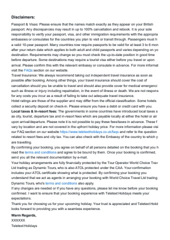 Disclaimers:Passport&Visas:PleaseensurethatthenamesmatchexactlyastheyappearonyourBritishpassport.Anydiscrepanciesmayresultinupto100%cancellationandrebook.Itisyoursoleresponsibilitytoverifyyourpassport,visa,andotherimmigrationrequirementswiththeappropriaembassiesorconsulatesforthecountriesyouplantovisitortransitthrough.Passengersmusthavalid10-yearpassport.Manycountriesnowrequirepassportstobevalidforatleast3to6monafteryourreturndatewhichappliestobothadultandchildpassportsandvariesdependingonyodestination.Requirementsmaychangesoyoumustchecktheup-to-datepositioningoodtimebeforedeparture.Somedestinationsmayrequireatouristvisaeitherbeforeyoutraveloruponarrival.Pleaseconfirmthiswiththerelevantembassyorconsulateinadvance.Formoreinformatvisitthesectiononourwebsite.TravelInsurance:Wealwaysrecommendtakingoutindependenttravelinsuranceassoonaspossibleafterbooking.Amongotherthings,yourtravelinsuranceshouldcoverthecostofcancellationshouldyoubeunabletotravelandshouldalsoprovidecoverformedicalemergencisuchasillnessorinjuryincludingrepatriation,intheeventofillnessordeath.Wearenotresponsforanycostsyouincurasaresultoffailingtotakeoutadequatetravelinsurance.Hotelratingsarethoseofthesupplierandmaydifferfromtheofficialclassification.Somehotelscollectasecuritydepositoncheck-in.Pleaseensureyouhaveadebitorcreditcardwithyou.Thegovernmentsinsomecountrieshaveintroducedlocaltaxessascity,tourist,departuretaxandin-resortfeeswhicharepayablelocallyateitherthehotelorairuponarrival/departure.Pleasenoteitisnotpossibletopaythesefees/taxesinadvance.Thesefvarybylocationandarenotcoveredintheupfrontholidayprice.FormoreinformationpleasevisiourFAQsectiononourwebsiteandrefertothequestionrelatedtoresortfeesandcitytax.YoucanalsocheckwiththeEmbassyofthecountrytowhichyaretravelling.Byconfirmingyourbooking,youagreeonbehalfofallpersonsdetailedonthebookingthatyouhreadtheandagreetobeboundbythem.Onceyourbookingisconfirmed,sendyoualltherelevantdocumentationbye-mail.YourholidayarrangementsarefullyfinanciallyprotectedbytheTourOperatorWorldChoiceTravLtdtradingasDynamicTours,whoisalsoATOLprotectedundertheCAA.YourconfirmationincludesyourATOLcertificateshowingwhatisprotected.ByconfirmingyourbookingyouunderstandthatweactasagentsinarrangingyourbookingwithWorldChoiceTravelLtdtradingDynamicTours,who'salsoapply.Ifanychangesareneededorifyouhaveanyquestions,pleaseletmeknowbeforeyourbookingconfirmed.IwanttoensurethatyourbookingexperiencewithTeletextHolidaysmeetsyourexpectations.Thankyouforchoosingusforyourupcomingholiday.YourtrustisappreciatedandTeletextHolidlooksforwardtoprovidingyouwithaseamlessexperience.WarmRegards,XXXXXXTeletextHolidaysFAQsLocaltaxes&In-resortfees:https://www.teletextholidays.co.uk/faqstermsandconditionstermsandconditions