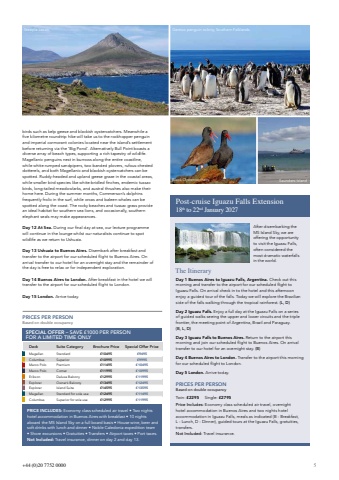 +44 (0)20 7752 00005After disembarking the MS Island Sky, we are offering the opportunity to visit the Iguazu Falls, often considered the most dramatic waterfalls in the world.The ItineraryPost-cruise Iguazu Falls Extension18th to 22nd January 2027DeckSuite CategoryBrochure PriceSpecial Offer PriceMagellanStandard ColumbusSuperiorMarco PoloPremium Marco PoloCorner EriksonDeluxe BalconyExplorerOwner%u2019s BalconyExplorerIsland SuiteMagellanStandard for sole useColumbusSuperior for sole use%u00a310495%u00a310995%u00a311495%u00a311995%u00a312995%u00a313495%u00a314595%u00a312495%u00a312995%u00a39495%u00a39995%u00a310495%u00a310995%u00a311995%u00a312495%u00a313595%u00a311495%u00a311995PRICES PER PERSONBased on double occupancySPECIAL OFFER %u2013 SAVE %u00a31000 PER PERSON FOR A LIMITED TIME ONLYbirds such as kelp geese and blackish oystercatchers. Meanwhile a five kilometre roundtrip hike will take us to the rockhopper penguin and imperial cormorant colonies located near the island%u2019s settlement before returning via the %u2018Big Pond%u2019. Alternatively Bull Point boasts a diverse array of beach types, supporting a rich tapestry of wildlife. Magellanic penguins nest in burrows along the entire coastline, while white-rumped sandpipers, two-banded plovers, rufous-chested dotterels, and both Magellanic and blackish oystercatchers can be spotted. Ruddy-headed and upland geese graze in the coastal areas, while smaller bird species like white-bridled finches, endemic tussac birds, long-tailed meadowlarks, and austral thrushes also make their home here. During the summer months, Commerson%u2019s dolphins frequently frolic in the surf, while orcas and baleen whales can be spotted along the coast. The rocky beaches and tussac grass provide an ideal habitat for southern sea lions, and occasionally, southern elephant seals may make appearances.Day 12 At Sea. During our final day at sea, our lecture programme will continue in the lounge whilst our naturalists continue to spot wildlife as we return to Ushuaia.Day 13 Ushuaia to Buenos Aires. Disembark after breakfast and transfer to the airport for our scheduled flight to Buenos Aires. On arrival transfer to our hotel for an overnight stay and the remainder of the day is free to relax or for independent exploration.Day 14 Buenos Aires to London. After breakfast in the hotel we will transfer to the airport for our scheduled flight to London.Day 15 London. Arrive today.Day 1 Buenos Aires to Iguazu Falls, Argentina. Check out this morning and transfer to the airport for our scheduled flight to Iguazu Falls. On arrival check in to the hotel and this afternoon enjoy a guided tour of the falls. Today we will explore the Brazilian side of the falls walking through the tropical rainforest. (L, D)Day 2 Iguazu Falls. Enjoy a full day at the Iguazu Falls on a series of guided walks seeing the upper and lower circuits and the triple frontier, the meeting point of Argentina, Brazil and Paraguay. (B, L, D)Day 3 Iguazu Falls to Buenos Aires. Return to the airport this morning and join our scheduled flight to Buenos Aires. On arrival transfer to our hotel for an overnight stay. (B)Day 4 Buenos Aires to London. Transfer to the airport this morning for our scheduled flight to London.Day 5 London. Arrive today.PRICES PER PERSONBased on double occupancyTwin: %u00a32295 Single: %u00a32795Price Includes: Economy class scheduled air travel, overnight hotel accommodation in Buenos Aires and two nights hotel accommodation in Iguazu Falls, meals as indicated (B - Breakfast, L - Lunch, D - Dinner), guided tours at the Iguazu Falls, gratuities, transfers. Not Included: Travel insurance.PRICE INCLUDES: Economy class scheduled air travel %u2022 Two nights hotel accommodation in Buenos Aires with breakfast %u2022 10 nights aboard the MS Island Sky on a full board basis %u2022 House wine, beer and soft drinks with lunch and dinner %u2022 Noble Caledonia expedition team %u2022 Shore excursions %u2022 Gratuities %u2022 Transfers %u2022 Airport taxes %u2022 Port taxes.Not Included:Travel insurance, dinner on day 2 and day 13.Steeple JasonGentoo penguin colony, Southern FalklandsBlack OystercatchersSaunders Island