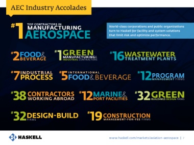 AEC Industry Accolades top contractors in World-class corporations and public organizations turn to Haskell for facility and system solutions that limit risk and optimize performance. www.haskell.com/markets/aviation-aerospace | 7
