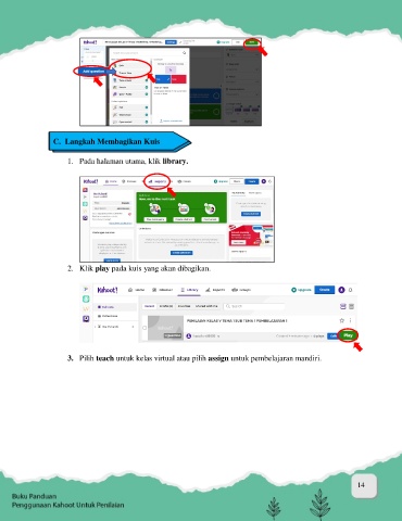 C. Langkah Membagikan Kuis 1. Pada halaman utama, klik library. 2. Klik play pada kuis yang akan dibagikan. 3. Pilih teach untuk kelas virtual atau pilih assign untuk pembelajaran mandiri. 14
