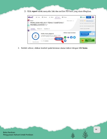 2) Klik report untuk menyalin link dan melihat PIN kuis yang akan dibagikan. 4. Setelah selesai, silakan kembali pada halaman utama kahoot dengan klik home. 18