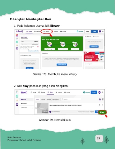 C. Langkah Membagikan Kuis 1. Pada halaman utama, klik library. Gambar 28. Membuka menu library 2. Klik play pada kuis yang akan dibagikan. Gambar 29. Memulai kuis 25