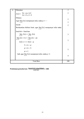 13 4. Diketahui: %u0006(%u0008) = 3%u0008 %u2212 \2%u0008 + 1, %u0008 > 2 Ditanya: Agar lim %u0006(%u0008) mempunyai nilai, maka \%u0008%u21922Jawab: Berdasarkan definisi limit, agar lim %u0006(%u0008) mempunyai nilai maka %u0008%u21922limit kiri = limit kan lim %u0006(%u0008) = lim %u0006(%u0008) %u0008%u21922+ %u0008%u21922%u2212lim (2%u0008 + 1) = lim (3%u0008 %u2212 \%u0008%u21922+ %u0008%u21922%u22122(2) + 1 = 3(2) %u2212 \5 = 6 %u2212 \\\Jadi, agar lim %u0006(%u0008) mempunyai nilai, maka p =1. %u0008%u219222 2 2 2 2 3 3 5 4 Total Skor 100 ()*+,-. /).01+2-.: 4-.5-1 01+2 5-.ffl *6*-/-7 %u00d7 9:: 7+7-; 01+2