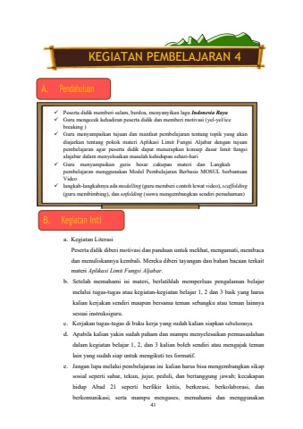 41 a. Kegiatan Literasi Peserta didik diberi motivasi dan panduan untuk melihat, mengamati, membaca dan menuliskannya kembali. Mereka diberi tayangan dan bahan bacaan terkait materi Aplikasi Limit Fungsi Aljabar. b. Setelah memahami isi materi, berlatihlah memperluas pengalaman belajar melalui tugas-tugas atau kegiatan-kegiatan belajar 1, 2 dan 3 baik yang harus kalian kerjakan sendiri maupun bersama teman sebangku atau teman lainnya sesuai instruksiguru. c. Kerjakan tugas-tugas di buku kerja yang sudah kalian siapkan sebelumnya.d. Apabila kalian yakin sudah paham dan mampu menyelesaikan permasaalahan dalam kegiatan belajar 1, 2, dan 3 kalian boleh sendiri atau mengajak teman lain yang sudah siap untuk mengikuti tes formatif. e. Jangan lupa melalui pembelajaran ini kalian harus bisa mengembangkan sikap sosial seperti sabar, tekun, jujur, peduli, dan bertanggung jawab; kecakapan hidup Abad 21 seperti berfikir kritis, berkreasi, berkolaborasi, dan berkomunikasi; serta mampu mengases, memahami dan menggunakan KEGIATAN PEMBELAJARAN 4%uf0fc Peserta didik memberi salam, berdoa, menyanyikan lagu Indonesia Raya %uf0fc Guru mengecek kehadiran peserta didik dan memberi motivasi (yel-yel/ice breaking ) %uf0fc Guru menyampaikan tujuan dan manfaat pembelajaran tentang topik yang akan diajarkan tentang pokok materi Aplikasi Limit Fungsi Aljabar dengan tujuan pembelajaran agar peserta didik dapat menerapkan konsep dasar limit fungsi alajabar dalam menyelsaikan masalah kehidupan sehari-hari %uf0fc Guru menyampaikan garis besar cakupan materi dan Langkah pembelajaran menggunakan Model Pembelajaran Berbasis MOSUL berbantuan Video %uf0fc langkah-langkahnya ada modelling (guru memberi contoh lewat video), scaffolding(guru membimbing), dan unfolding (siswa mengembangkan sendiri pemahaman)