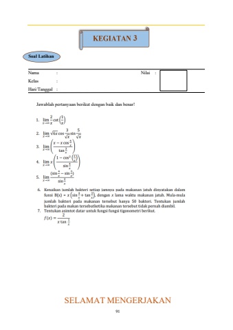 91 Jawablah pertanyaan berikut dengan baik dan benar! SELAMAT MENGERJAKAN 3Soal Latihan Nama Kelas Hari/Tanggal:::Nilai :