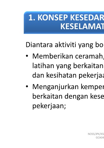 yang boleh adalah: dijalankan dan ceramah, penerangan keselamatan dengan pekerjaan; pameran dan kempen kesihatan dan keselamatan NOSS/JPK/KSM JULAI 2017 GCA04(CA04)