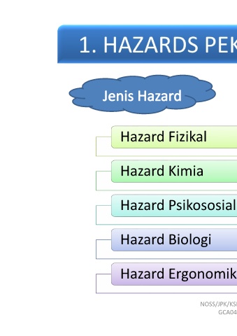 Hazard Fizikal Hazard Kimia Hazard Psikososial Hazard Biologi Hazard Ergonomik NOSS/JPK/KSM JULAI 2017 GCA04(CA04)