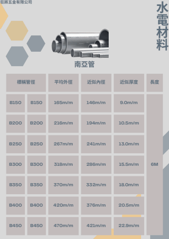 %u5de8%u5c07%u4e94%u91d1%u6709%u9650%u516c%u53f8%u6a19%u7a31%u7ba1%u5f91 %u5e73%u5747%u5916%u5f91 %u8fd1%u4f3c%u5167%u5f91 %u8fd1%u4f3c%u539a%u5ea6 %u9577%u5ea6B150 B150 165m/m 146m/m 9.0m/m6MB200 B200 216m/m 194m/m 10.5m/mB250 B250 267m/m 241m/m 13.0m/mB300 B300 318m/m 286m/m 15.5m/mB350 B350 370m/m 332m/m 18.0m/mB400 B400 420m/m 376m/m 20.5m/mB450 B450 470m/m 421m/m 22.9m/m%u5357%u4e9e%u7ba1%u6c34%u96fb%u6750%u6599