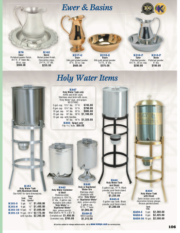 Holy Water Container & Shelf Stainless steel. Container is 101⁄2˝ H., 8˝ dia., 2 gallon cap. Available with either ‘Holy Water’ or
