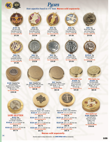 K187 Pyx 24k gold plate. Enameled emblem. 2˝ x 5⁄8˝. 7 host cap. Use with burse K3110. $72.00